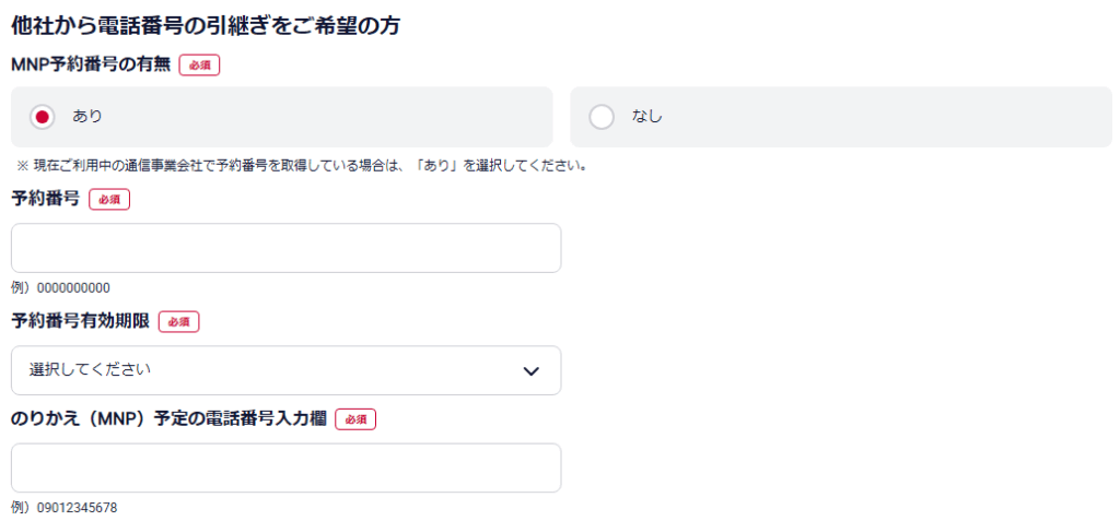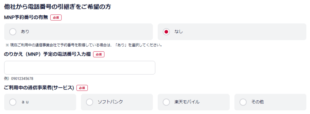 他社から乗り換え(MNP)で契約する場合、MNP予約番号の有無を選択してください。