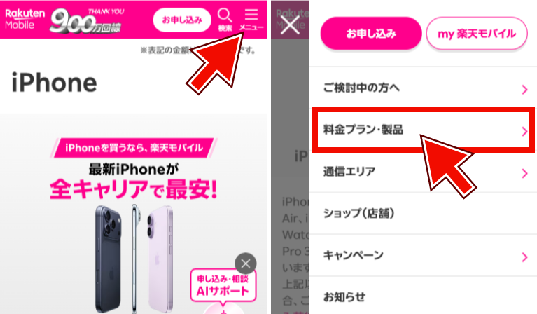 楽天モバイル公式サイトにアクセスし、右上のハンバーガーメニューから「料金プラン・製品」を選択します。