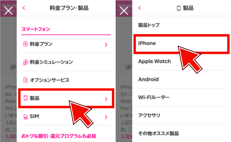 その後、「製品」から「iPhone」を選択し、取り扱っているiPhone一覧のページにアクセスします。