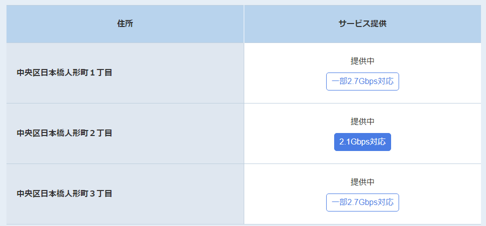 場所を「東京都中央区日本橋人形町」にしてみると、1丁目と3丁目は「一部2.7Gbps対応」、2丁目は「2.1Gbps対応」と記載があります。2丁目だけは全域で2.1Gbpsに対応していると読み取れます。
